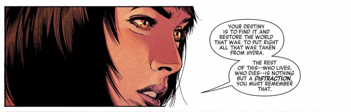 As for the Cosmic Cube of it all, that is indeed problematic. Steve reunites with his evil faux-mother Elisa/Madame Hydra and she reemphasizes the importance of getting ahold of the Cosmic Cube. The squabbles of the Hydra Council mean next to nothing to her; she just wants Steve to rewrite reality. Spencer writes some very particular words for Elisa that are hard to ignore: