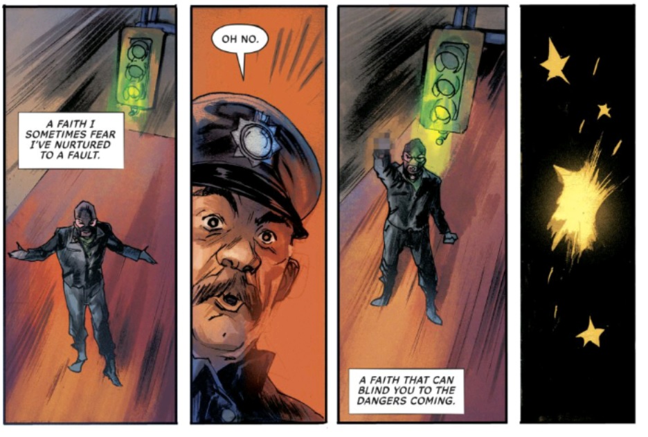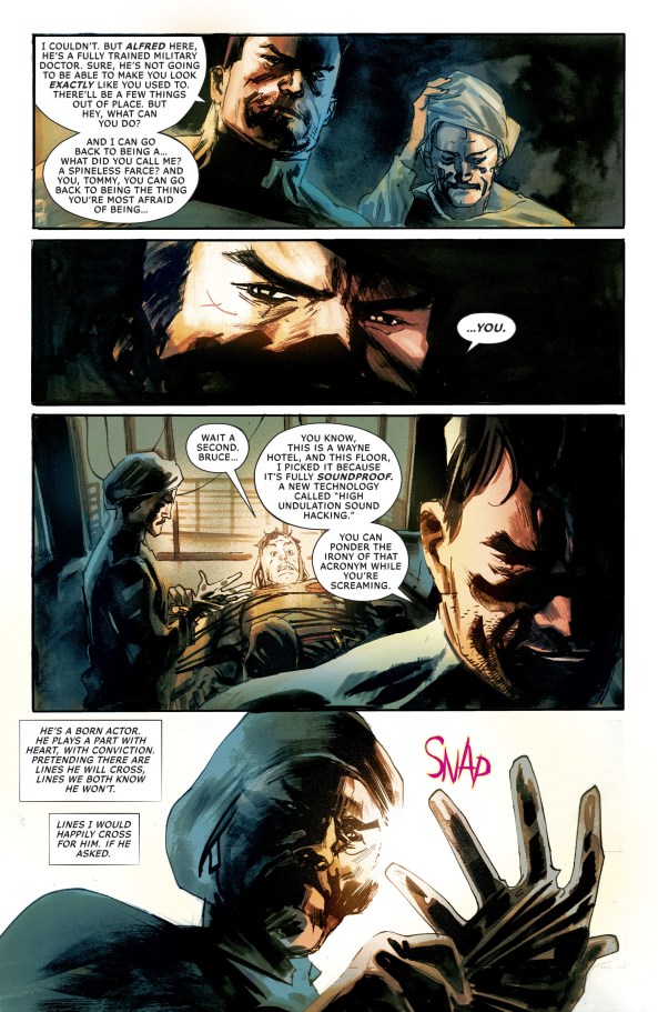 It’s almost a shame that this isn’t a more Batman-centric story because I really enjoy Rafael Albuquerque indulging in his horror genre skills to draw a menacing and frightening Batman. I mentioned my fondness for Bruce’s “reverse plastic surgery threat” earlier, which is only highlighted by Albuquerque’s pencils and inks. The operating room aesthetic of one blinding fluorescent light among the shadows places Bruce, Alfred, and Elliot in a virtual interrogation room where Bruce is most definitely the bad cop. And for you Hush haters out there, there’s a potential read of the shortcomings of Tommy Elliot as a character: he is afraid to be himself/creators are afraid to use him because there’s not a whole lot there.