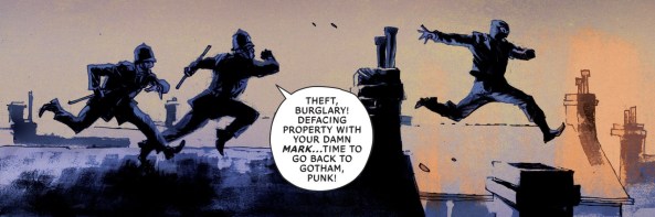 I was almost positive that Alfred was going to end up being the young man in the mask running from “the bobbies” but dammit if Snyder didn’t make me second guess myself. I’ll admit that for a minute there I was genuinely fooled by the overlapping narration, thinking that this was a young Bruce Wayne flashback. After all, we had an angry young man defiantly giving the middle finger — a hallmark of Zero Year Bruce Wayne.