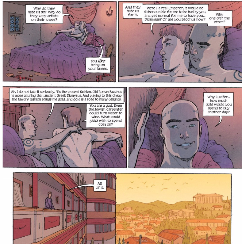 Lucifer is motivated by a desire to gain just one more day of life, and a desire to prove himself worthy after being looked down upon and hated for his role as both an artist and as a Catamite. While some of the details of his situation are specific to the time, for the most part it shows that people’s motivations stay the same no matter how much times change, and that prejudice is just as dangerous and harmful in any time period. It also continues to ground each incarnation of the Pantheon in their specific time and circumstances; the Lucifer of 455 has a far different background and concerns than the Lucifer of 2014. Yet, both are “a difficult one,” to quote Ananke — the troublemaker of the Pantheon. That will probably never change.