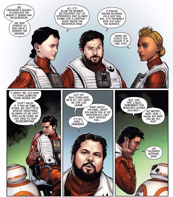 Taulor, where did you get the idea that Poe Dameron was pragmatic to the point of assholery? I’m behind on the comic, only reading the first volume, but from the movie I never got the sense of Poe being like that. Instead, he seemed to be a man who was highly accepting and kind, naming Finn because he deserved to be a person, not a stormtrooper, and without question insisting that Finn keeps his jacket.