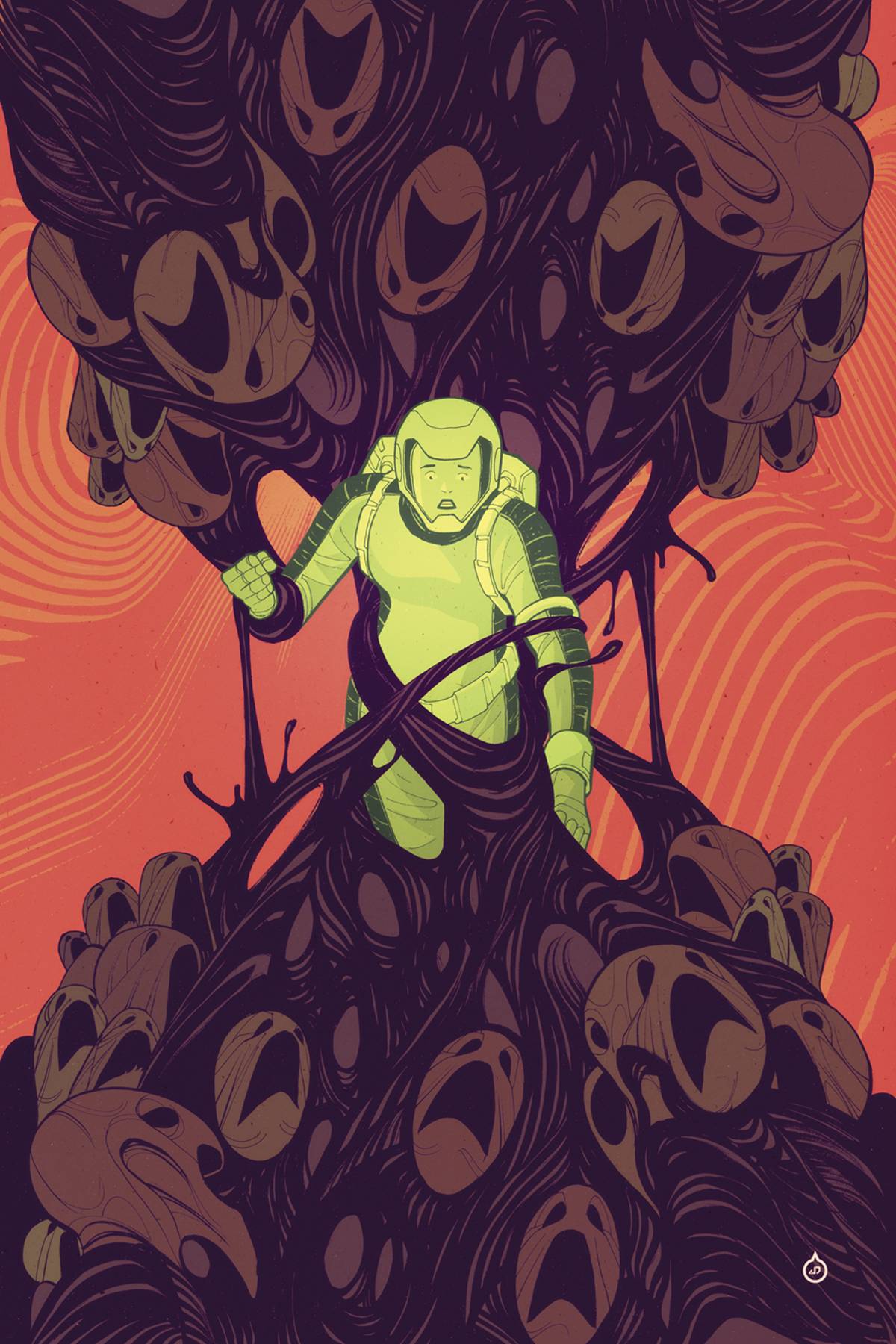 Issue 1 taught us the rules — the universe is empty of life save for Earth, and Sarah, a member of a military exploratory forensics team, travels from planet to planet communicating with the souls of the dearly departed aliens. The first issue made it apparent that there is a looming threat to the spirits of the dead, and that most Sarah’s crewmates do not believe in her paranormal abilities. Picking up there, the audience gets a bit more characterization from the humans in the story and the squad dynamics solidified as the team debriefs from their last data-collecting drop.