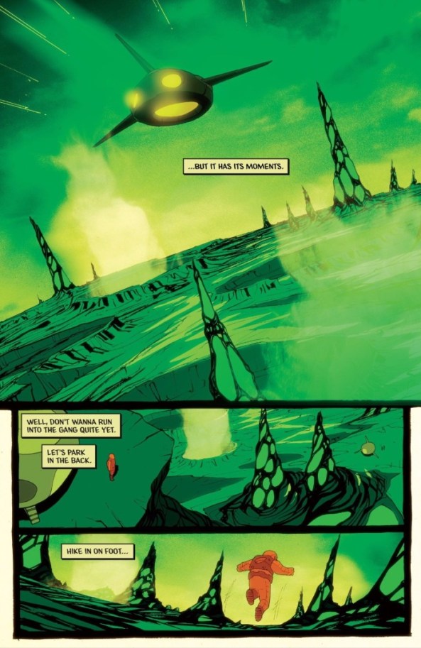 This planet seems both hostile and strange, with its orange and green, and its spire-esque structures jutting from the surface working to visually and thematically recall the Tower of Babel. Here, we meet another alien with an allegorical story who finally gives a name to the specter who attacked Sarah in the first issue: The Faded Man. The “spirit plane” pieces are rewarding, and I’m enjoying that as a narrative device.
