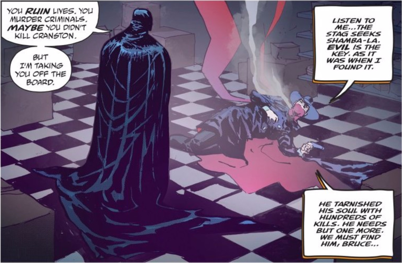 Indeed, the disconnect between the ease with which we grasp what’s going on and Batman’s failure to do so is kind of the tension that drives this issue. We understand that Batman is participating in a crossover with the Shadow, so we’re willing to accept some mystical elements along with the pulpy noir world Batman already lives in. So when the Shadow insists that he was always Henri Ducard, Batman can’t believe it, but we immediately understand that it’s possible (though still a surprising twist). Moreover, we understand that the Shadow is a good guy and that he (and potentially his enemy, the Stag) can cloud the minds of men, such that they can’t trust their eyes, so we’re one step ahead of Batman when he denies these truths.