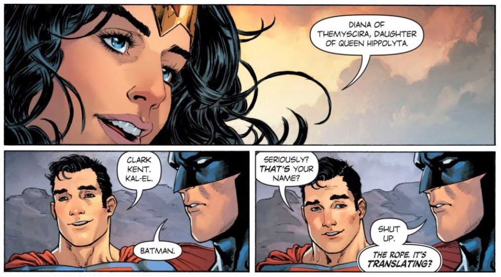 This is such a welcome stark contrast from Geoff Johns’ cold New 52 introduction and Batman v. Superman’s…whatever that was. Batman and Superman may be the reader’s POV but the focus is still on Wonder Woman and the world’s awe of her. Superman is friendly and humorous while Batman plays the straight man without being a judgmental asshole. That’s why this story works so well: the skeptical Dark Knight even has to admit that there’s something admirable and hopeful about Diana.
