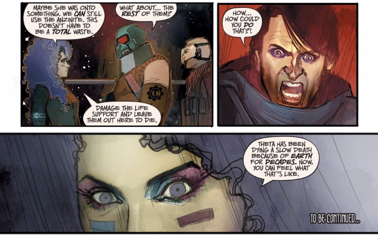 The rebels — led by Commander Willow — want Theta to be independent of Earth, but their plan to achieve it involves blowing up the Earth! They don’t just want to “break-up” with the Earth, they want to do so in the most painful way possible. That appears to be more out of spite than necessity (blowing up the Earth is their Plan A, not a back-up), something that carries over to just about every choice Willow makes throughout the issue.