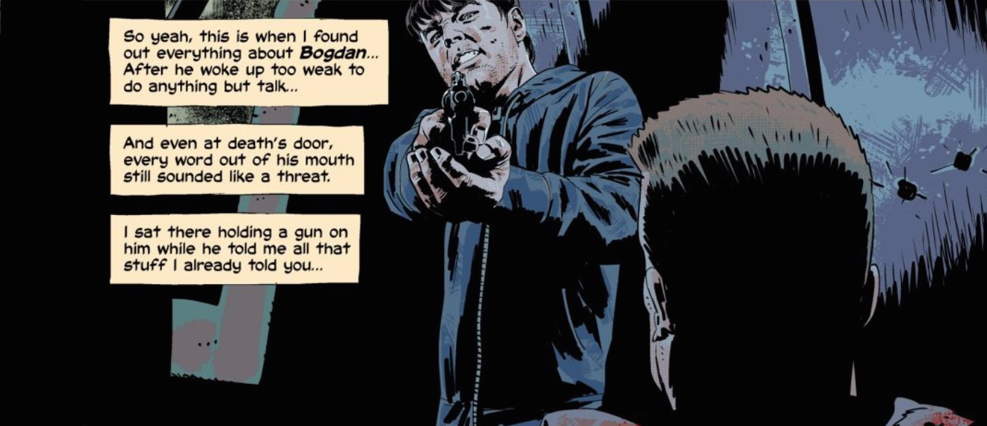 That’s a lot of backstory on Bogdan and his plans, but it wouldn’t be an Ed Brubaker book if I didn’t have to bring up the provenance of the narration. Dylan has acknowledged all along that his narration is giving us info that he didn’t have at the time, confirming that he’s narrating this story from some point in the future, but this issue actually catches us up to the info, showing exactly when and how Dylan learns everything he knows about Bogdan.