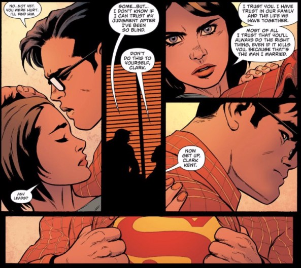 Bruce and Clark’s final fight begin with a brief reminiscence about the day Clark told Bruce that Lois was pregant (except Bruce already worked it out)