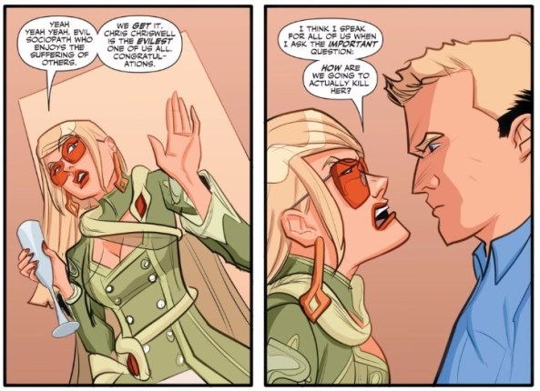Chris Chriswell is feeling pretty high on himself and wants to celebrate and gloat about his evil triumph. This is textbook villain behavior and already endangers the Faithless’ mission. Sidney checks Chriswell on the error of her ways but soon makes another common, villainous error of her own: instead of simply killing Faith, Sidney opens the whole conversation about how they will her. It’s a well known trope that villains can’t simply kill superheroes. Instead they often opt for elaborate ways to end the life of their nemesis with some sort of poetic flair. However, it’s this very argument between the Faithless which allows for Faith’s escape.