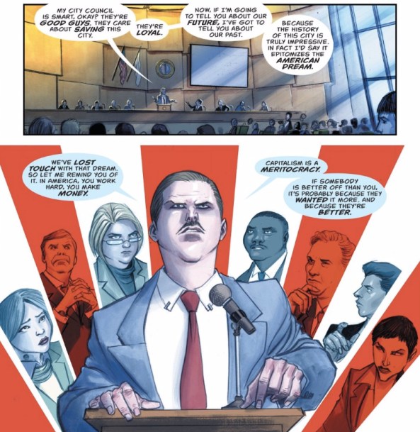 Most obvious is the strange origin myth of the Ninth Circle — spouting prophecies in full Ninth Circle garb, Broderick’s become no different than your typical Batman villain — but those kind of fantasies tie in rather depressingly to some real life fairy tales. Broderick and his cronies are big believers in the lie that having money inherently makes one better than someone without money.