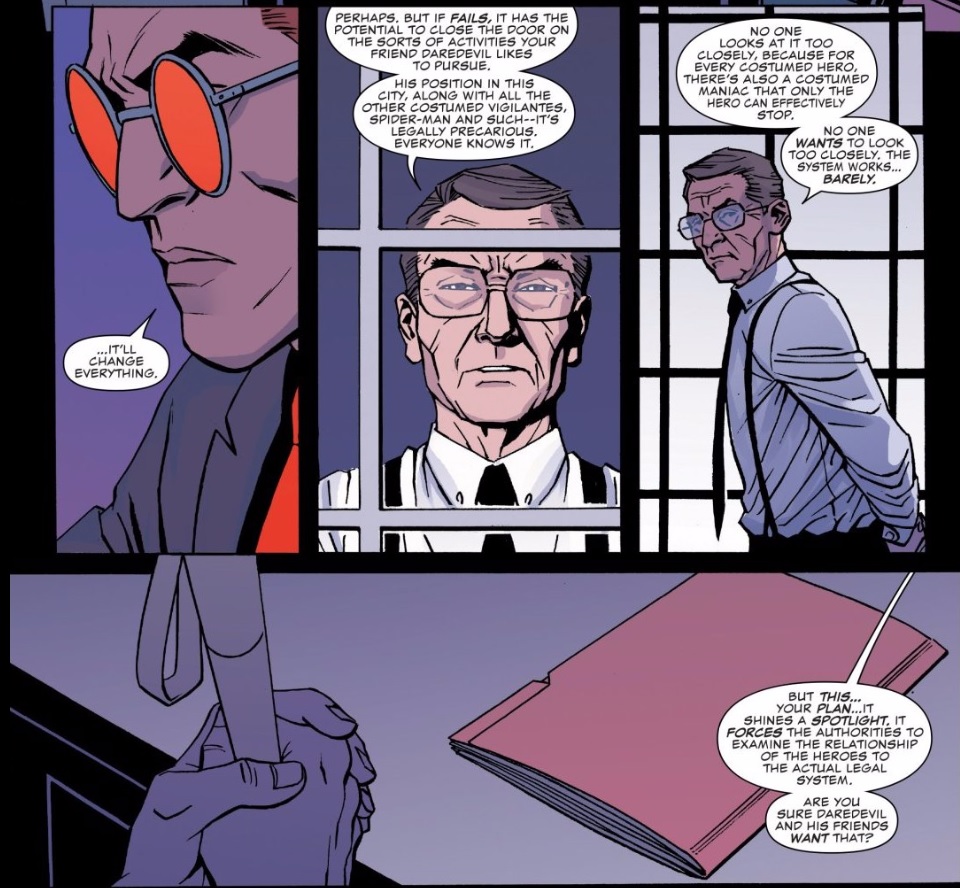 As the man without fear, Matt has the courage to pursue his goal despite the danger involved, and in all honesty, the rewards if he succeeds likely are worth the risk. Knowing that he’s doomed to failure, though, casts this entire enterprises in a different light. Matt’s “discussed the matter over with Daredevil,” meaning he’s acting alone on this. That may be necessary for the plan, but it’s still a bad habit Matt’s developed since regaining his secret identity. Daredevil may be willing to live with the consequences, but if he fails, what happens to heroes with public identities (like his fellow Defenders), or known associates of heroes (such as Parker Industries), or even the more vulnerable masked heroes (such as Miles Moreales or Kamala Khan)? Their freedom has been put on the line without their even knowing it.