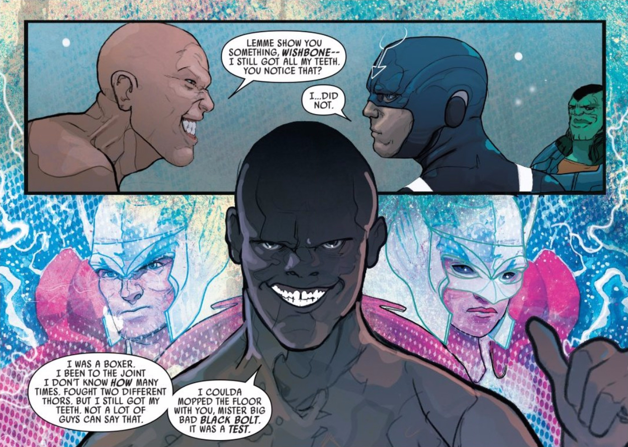 Drew: Serious question: what is the purpose of prison? Is it to punish criminals, or to rehabilitate them? I get that the goal, at least ideally, is “both,” but it seems at least possible to me that those purposes might be mutually exclusive. One is focused on the past, somehow paying a debt to society, while the other is focused on the future, somehow getting a loan from society (you know, assuming that any rehabilitation actually happens). More to the point: symbolically, it forces prisoners to live in the past, putting the life they used to have (both criminal and non-criminal) in the forefront of their minds. I don’t bring this up to kick off an essay on the vicious cycle that prison creates, but to lend context to the prisoners’ fixation on their own pasts in Black Bolt 2.