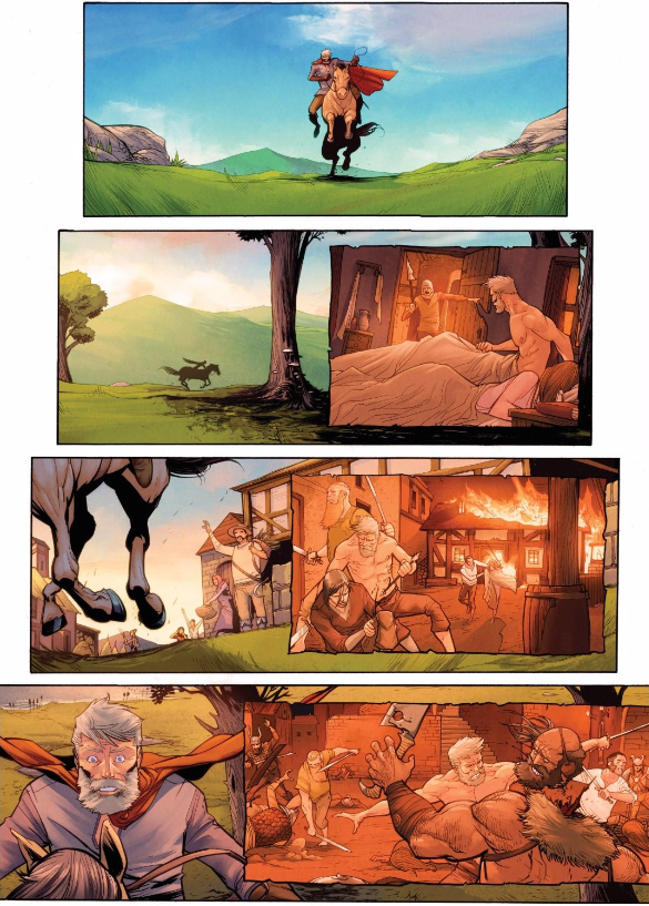There’s a lot going on in this sequence, but I want to start by looking at Bertwald’s direction of motion. Thanks to our left-to-right reading system, audiences in the west tend to associate left-to-right motion with forward progress, something Camuncoli plays conventionally in that second panel. But, of course, the progress here isn’t exactly forward, so Camuncoli complicates that by having Bertwald ride towards the left of the page in that third column, and straight towards us at the top and bottom of the page. The result is disorienting, perfectly reflecting Bertwald’s confusion and disbelief at his situation — all of which is complicated by those memories that take up an increasing amount of space on the page. Note that Camuncoli superimposes those memories over these other panels, roughing up their edges as if to suggest that these are mere stories written on parchment that can easily be brushed aside. His memories are no longer a part of reality.