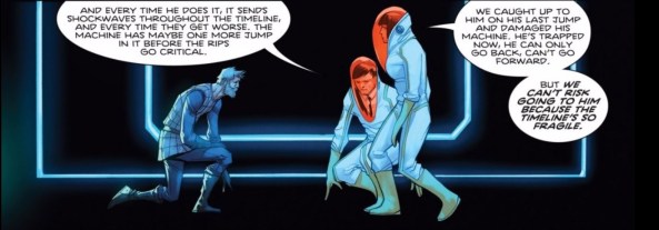 Drew: The first time travel story I remember experiencing is Teenage Mutant Ninja Turtles III. Its time-travel mechanic was as logical as it needed to be to satisfy six-year-old me, but it left me with some weird assumptions about how time worked. Specifically, the way the movie intercuts between its present-day and feudal Japan scenes convinced me that the past is playing out in parallel with the present. That is, even though time travel is possible, if I travel to the past, wait five minutes, then return to the present, I can only arrive five minutes after I left. It makes no logical sense, but continues to be a popular feature of time travel stories in order to allow them to follow separate storylines in separate time periods simultaneously. Indeed, it’s a technique employed judiciously in Green Valley 9, as Max Landis and Giuseppe Camuncoli delight in touching upon just about every time travel trope as they draw the series to a close.