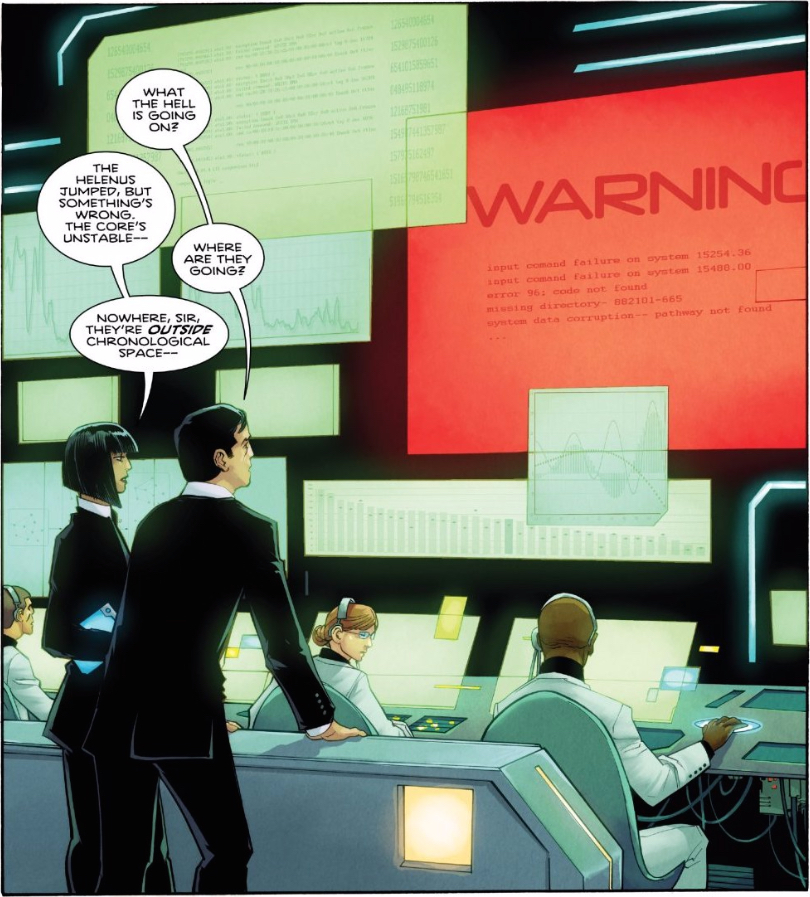 They’re somehow watching the events of this issue play out in real time, even though they happened hundreds of years ago. How can people with the ability to see through time be surprised at what happens next? I get the hand-waving necessary for time-travel stories, but I can’t help but think Landis is intentionally drawing our attention to how nonsensical this is. He needs them to offer some explanation of what is happening, but he can’t do so without lampshading how absurd that idea is.
