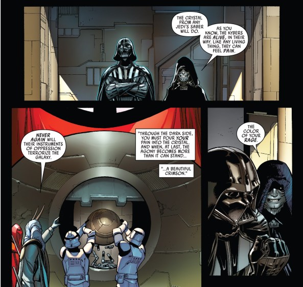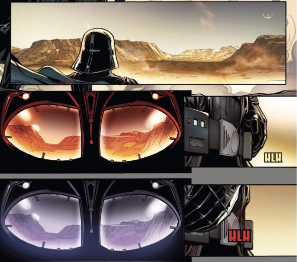 2. A little point of trivia to add to the discussion of the panels with Vader’s lenses: Vader’s eyepieces in A New Hope are red, but in Empire and Jedi they used different versions of the costume that no longer had red eyes. I gather that this was explained in universe in some convoluted way in the old EU canon, though I couldn’t say how, but I think these panels could be a subtle – and much simpler – explanation for why Vader’s lenses change color. I don’t by any means disagree with your read of those panels, Patrick, but I think they might also be a subtle (and effective in my book) way of streamlining and revising away some of the nonsense of the old EU canon.