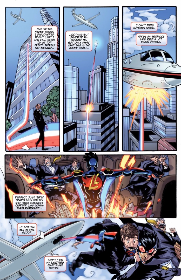 The part I’m still making up my mind about is Daniel’s powers. His speed powers being so new, Daniel knows not the full extent of his abilities. One nice way they put a bit of spice on the speedster gimmick is by making him impervious to pain while he runs, but the forces take a toll on his body, leaving him in the emergency room both times we see him use his powers. Though he can also heal at an accelerated rate, the cost of his powers will surely set up some high-stakes situations when he inevitably taxes his body to the point of potential long-term damage; however, the skeptic in me has a hard time believing that this character can do some things nearly instantaneously and with seeming ease, but ends his first fight with the walking arsenal baddie known as Barrage in a draw. Maybe I’m a stickler for the continuity of rules of power sets, but they help me understand and enjoy the comic more, so I’d love to see them more clearly defined. At least artist Damion Scott’s pencils, with their street art/graffiti-esque lineation, make the effects look cool enough, and match well with the tone of the text.