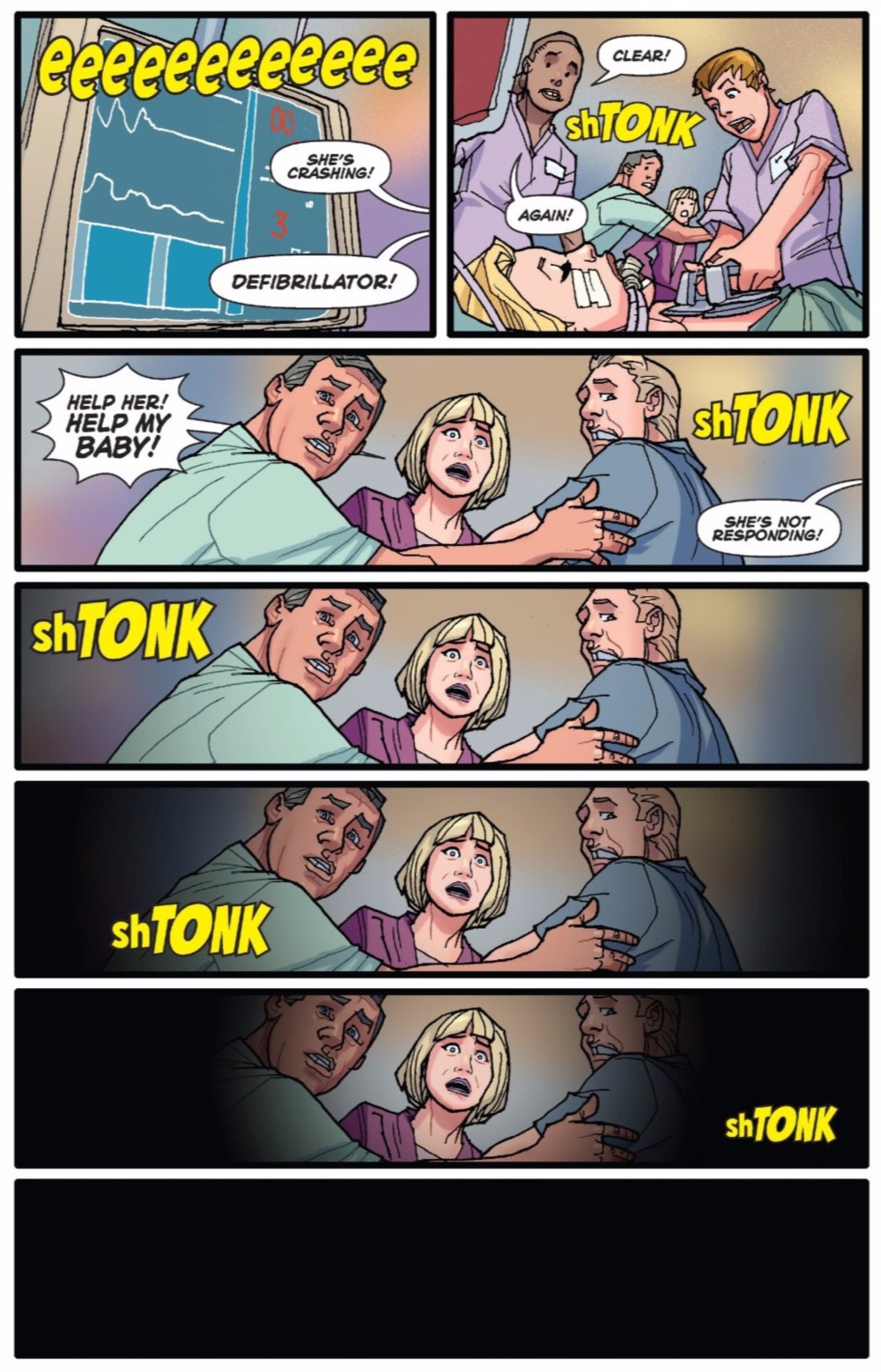 The issue ends with Betty’s heart flatlining and her parents watching as the darkness creeps in to take her away. It’s a shocking sequence, especially given the prototypical Archie Comics style of the preceding issue. Woods stages the final 5 panels such that you can’t help but focus on Mrs. Cooper’s horrified expression. This may be where “before” ends for this series. I have no idea what “after” looks like.