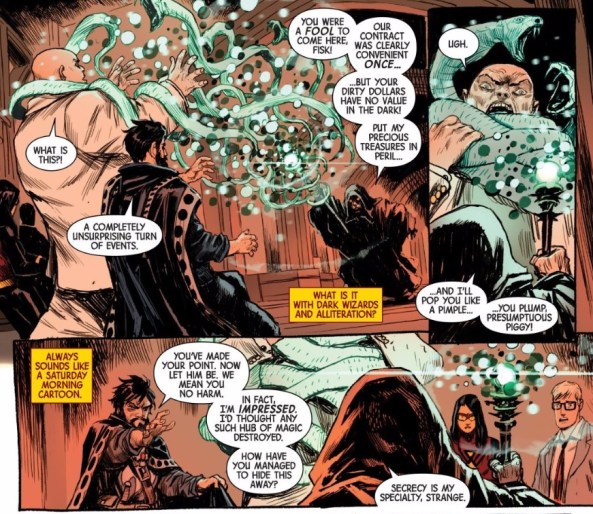 Got to say two things about this. It would be easy to accuse Hopeless of using Jessica and Ben solely because he loves the characters, meaning be damned. But this book is remarkably well cast. Hopeless is actually chosen characters really carefully. Urich is a great choice specifically because of his Daredevil roots – he knows Fisk’s evil and is the perfect counterpoint. Hell, even Matt Murdock himself wouldn’t be as valuable here. Urich’s experience with Fisk compared to his lack of experience with the situation is key here. Meanwhile, Jessica plays the role of the generic superhero, the counterpoint to Strange’s weirdness. Who expects things to be straight. And no one could be better than her in her role, because she is both able to fill the ordinary superhero role and has an existing relationship with Ben that makes the group dynamics stronger. And lastly, Fisk has always been a bit of a devil figure, especially with Secret Empire, and so is the perfect ‘ally for Strange, a man who is used to facing very different, more literal devils. Classic Strange trope, recontextualisied for DarkForce New York