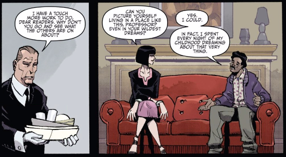 Besides modernizing the somewhat old-fashioned setting of the original game, Allor also seems to be taking care to assemble a roster who can bring different elements to the story. Senator White’s wheelings and dealings appear to be driving much of the behind the scenes plot, Mr. Green creates conflict every time he opens his mouth, and Miss Scarlett is likely intended, on some level, to be comedic relief — at one point Allor and Daniel straight-up use her to make a Scott Pilgrim vs. the World reference.