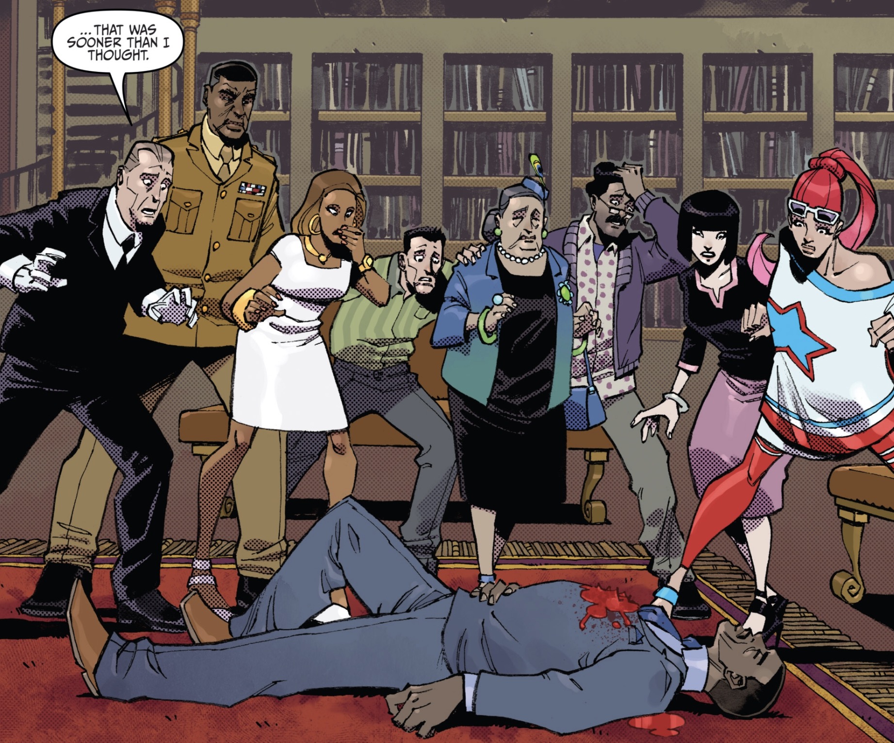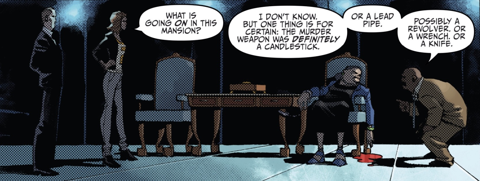 It’s impossible to tell how much weight we should assign to either murder, really, because so little is made of them. For one, the characters barely react to either death. In the aftermath of Mr. Boddy being shot, we’re treated to a single panel dedicated to everyone looking momentarily concerned.