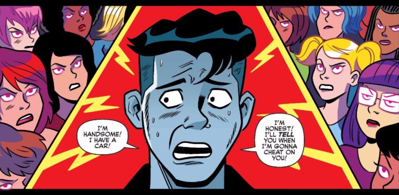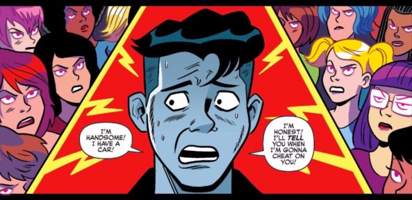 Charm lets us know exactly how much this is hurting Reggie. He is in the center of the panel in black and white, with lightning bolts of anxiety shooting off of him as he desperately tries to impress the angry pink-eyed women. He will not be able to win them over and he is doing this for his friend. Sabrina’s offer of a date is a benefit, but Reggie’s desire to help Jughead has been made clear. He may act like a jerk, and want you to think that he’s a jerk, but when you need him, he’s a jerk that’s on your side.