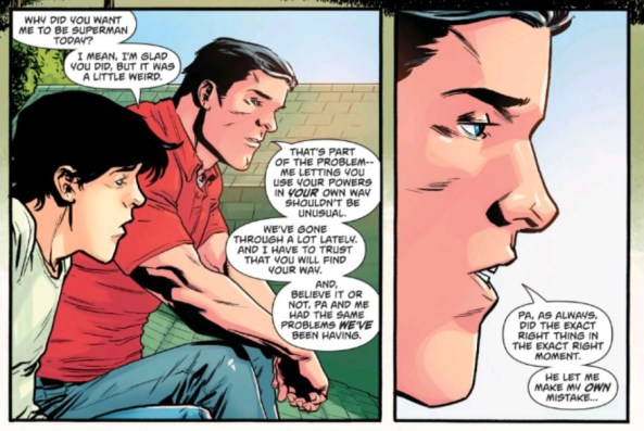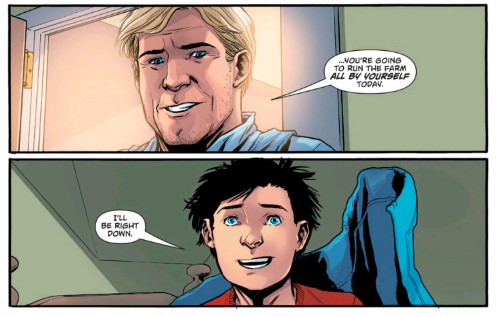 Superman 26 tells the age-old tale of father and son not understanding one another. While they’re out superheroing, Clark suggests careful planning and strategy while Jon prefers to go in headfirst. This is paralleled by a series of flashbacks where young Clark is similarly defiant of Pa Kent when he lets Clark run the farm for a day.