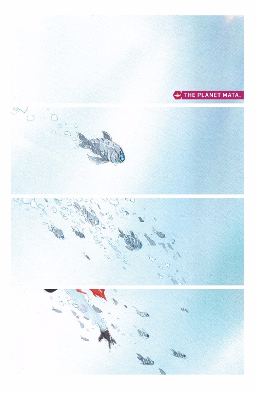 The only indication in the first panel that the comic has begun is the indication of the location, the planet Mata. A gentle blue irises on the right-hand side of the panel, and as your eye travels down the page, it’s difficult to tell that there even are panels. A fish glides into view, adding context to the first panel, then the next panel brings a flurry of fish and introduces an element of direction and movement, down and to the right. The gutters between the panels become more distinct here, before artist Dustin Nguyen, in the last image of the page, gives us the gloved hand, bare wrist, and a touch of the signature red of Telsa’s hair. The reader barely has time to think “oh shit!” before the page turn smashes us into a two-page spread of Telsa, floating and limp, wrapped in a hard layer of bubbles, hopeless.