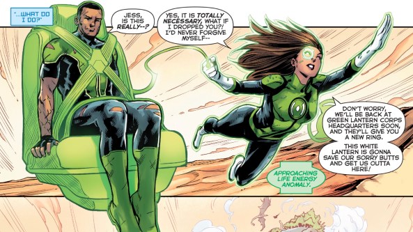 The issue is also an opportunity for writer Sam Humphries and artist Ronan Cliquet to put Jessica through her paces and have fun with the constructs she creates. Jessica takes charge this issue, and I especially enjoyed her strapping Simon in what’s essentially a child’s car seat so she can easily tote him around and keep him out of danger. As for Simon, the pieces of his shattered Power Ring are now embedded in his arm, the ramifications of which are saved for another issue. But despite the languid pace with which Humphries doles out his story, I continue to be onboard for the fun.