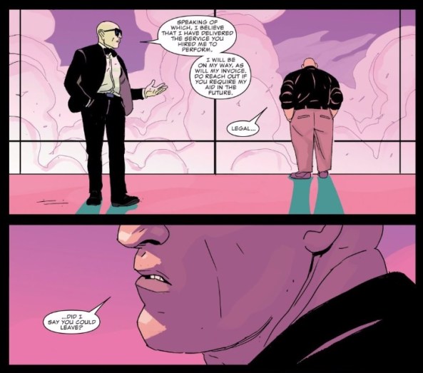 Kingpin is portrayed as a powerful, nuanced threat. He’s only in a few panels of the issue but Alec Morgan draws him as the statuesque, subtle power that he is. Kingpin’s muscle in action here is Tombstone, who attacks Matt Murdock on Kingpin’s behalf for the second time this arc.
