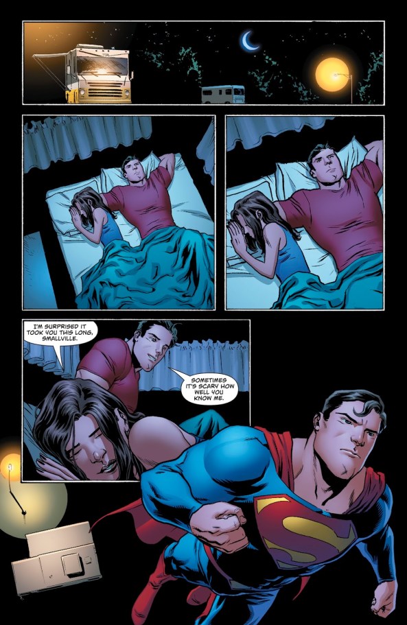 I think my favorite sequence of Godlewski’s is where Clark is sitting restless in bed with Lois. First and foremost this is a great example of Lois and Clark’s dynamic — she knows he needs to fulfill his compulsion for heroism. But visually I really dig the way that Godlewski makes use of the negative space here. Besides the white outline of the four initial panels, the black background envelopes the page. It’s almost as if Clark and Lois’ bed is floating in the same night sky that hangs above their RV in the previous panel. Godlewski then illustrates how Superman is quite literally above us all as Supes transcends the page in the final panel that is unbarred by a white exterior.