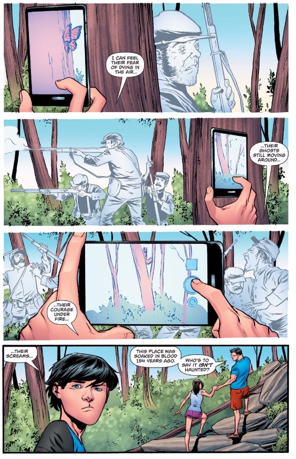 Actually, I love the contrast Godlewski, Tomasi, and Gleason create here. Jon is a modern kid viewing Gettysburg through the modern lens of his smartphone camera, which is a far cry from the fates of the young men we see playing out in flashback all around Jon. Jon gets to enjoy such a privileged existence precisely because of the sacrifices those young men made (and thankfully, Jon is a Kent through and through and clearly understands the gravity of this), but I get the sense that they’d be okay with that; that’s exactly why they were fighting, after all.