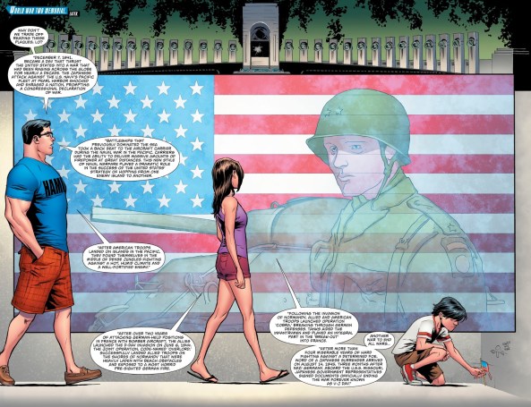 It’s with that same reverence that Tomasi and Gleason approach the Kent’s trip to D.C. Clark and Lois aren’t taking Jon to great American landmarks with souvenir t-shirts and postcards, they’ve taken him to these solemn places that exemplify real life heroism. Granted these places probably also have t-shirts and postcards, because capitalism.