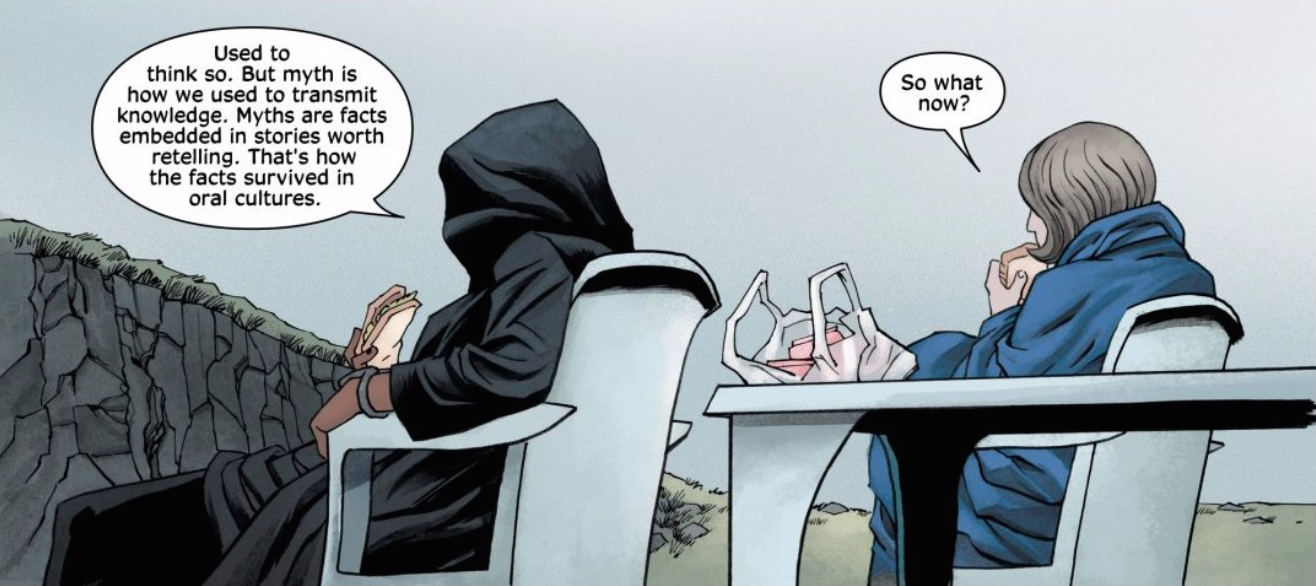 Obviously, there are cues to the importance of this moment beyond the presence of sandwiches (everything from its placement at the end of a page to the fact that Declan Shalvey and Jordie Bellaire do away with the gutters for this image, bleeding the image to the edge of the page, such that the other panels seem to take place within this one), but it’s the content of Brigid’s statement that does the heavy lifting. “Myths are facts embedded in stories worth retelling.” It’s an assertion of the value of truth in fiction, pointing at something beyond the thrills of a story about a magical, sentient computer program. Writer Warren Ellis is using this story to “transmit knowledge” — even if we don’t totally know what that knowledge will be. I’m a sucker for that kind of meta-commentary, so may be ascribing more importance to this moment than will necessarily pan out, but I’ll be damned if everything in this issue doesn’t confirm my reading.