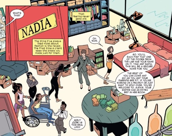 Having saved her friends from would-be assassins and securing her place as Janet Van Dyne’s protege, things are looking up for Nadia. It’s temping to think that this is enough of a happy ending for Nadia but writer Jeremy Whitley has a different idea. The entirety of this issue is comprised of various happy surprises Janet has for Nadia, now that they have admitted they like one another. First, Nadia gets some bodyguards, then she gets a paternity test to establish her American citizenship, then she’s reuinited with her friends from G.I.R.L., and finally Janet gifts Nadia a brand new lab.