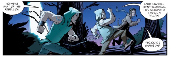 Korvath feels like a fairly paint-by-numbers fantasy realm, featuring a baddie warlord, some surprising beasts, and different technologies. It seems to me that Jay Faeber wanted to rush to the world-building aspect of the comic to set the stage for Earhart, Cort, and Tavel, but instead skipped giving us rich characters and really only gave us a few kernels of information about the universe. There is Lord Kragen who looks evil, has horns, and surrounds himself with other people who have horns, all while trying to suppress a resistance movement (which is populated, thus far, with people who do not have horns and sport tribal markings on their bodies). Also there are flying creatures, some of which are empathic. So audiences end up with characters who we can’t hook into and rushed exposition to set the main stage of this world. It reminds me a bit of Empress, which hurried readers, along with the stock characters, from sci-fi set piece to the next bigger set piece. But even the hardest of sci-fi writers need to build drama from a human perspective to make the space operas worth enjoying.