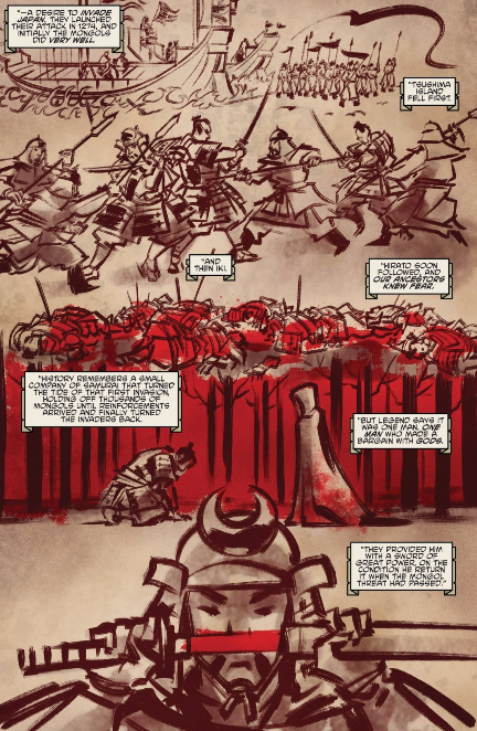 This issue also finds us at a fascinating intersection of medium and subject. Karai sees herself as an integral link between the the Foot Clan’s past and its future, and with that, a continuation of the history of Japan. We’re introduced to her little fetch-quest through a flashback/history lesson about Kublai Kahn leading the Mongols in invading Japan in the thirteenth century. Campbell and Burnham are tapping into an actual event from Japanese history, including the specific battle where a small group of samurai were able to fend off an enormous Mongol force until reinforcements arrived. Beyond that, Campbell taps into modes of ancient Japanese graphical presentation, combining the staging of the Mōko Shūrai Ekotaba with the graceful inky lines of Japanese calligraphy. Simply put, this is what Japanese history looks like.