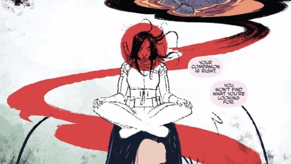 Throughout both this issue and the previous, there are a handful of small circular panels that draw the reader’s attention to whatever Karai is focusing on, and when she meditates to clear her head, we get that same technique again. Combining the red of the Kublai Kahn story with Karai’s focus circles, Campbell effectively plants Karai in the middle of the Japanese flag. This is how Karai sees herself — a product of both the history and mythology of Japan, and an important part of its future.