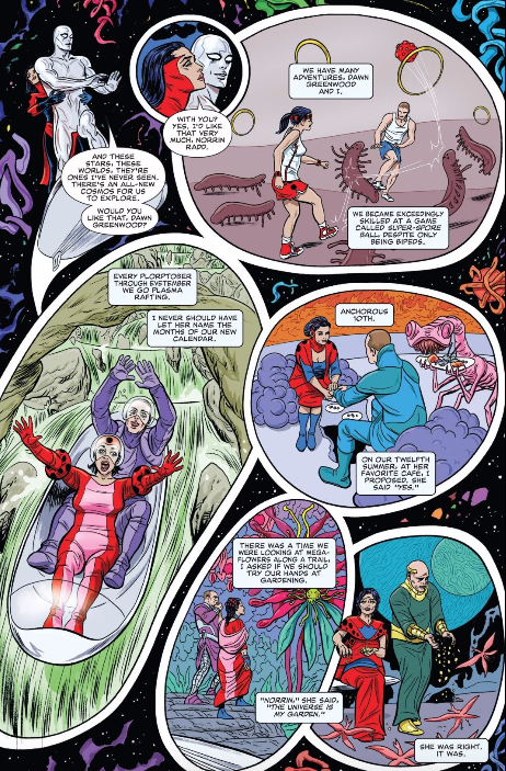 Sometimes I think I ask too much of comic books. I always want them to be grand statements about morality or the price of heroism or contain some other largely unknowable truth about the world. Silver Surfer is one of those series that sets this expectation for me, and the creative team of Dan Slott, Michael Allred, and Laura Allred obviously have a lot to say about life, love, and adventure. The penultimate issue of this series slows that all down by speeding up time, allowing the reader to bask in the simple sweetness of a life lived together. It is a rarity among comics — something nice just for the purpose of experiencing something nice.
