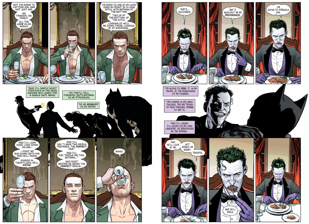 Janin keeps his layouts consistent across both pages to reinforce their equal positions, but otherwise, they couldn’t be more different. Joker and Riddler’s fantasies about killing Batman reveal quite a bit about themselves — Riddler wants to dominate Batman, wants to prove himself superior (because that’s what testing people with unsolveable riddles has always been about), while Joker wants a more intimate experience, one that will make Batman smile (because he’s still an obsessed showman at heart).