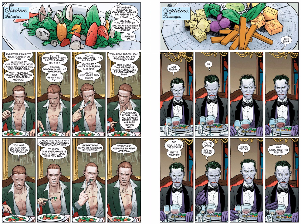 A few pages later, Janin and King pull the same move, only this time, Riddler and Joker get to sum their opponent up instead.