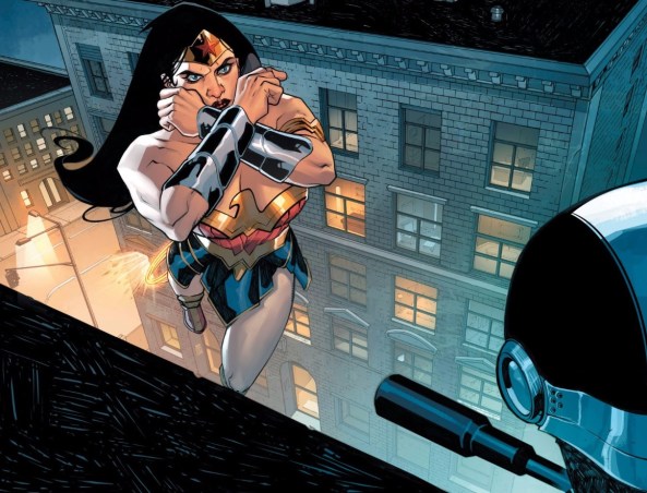 Diana is taking Etta Candy home from the hospital and feels that it is her responsibility to protect her during her recovery. The one problem with this plan is that Diana attracts danger wherever she goes, so it isn’t too long before her and Etta are attacked by an assassin. After Mayfly tries to take out Etta with a sniper rifle, Diana flies to her would be assassin in an action that is depicted in a full page spread.