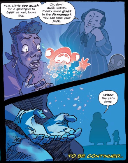 Church-lady has already made it clear in no uncertain terms that Ennay has no choice but to help her, but it’s also easy to infer that he wants the reward of a god of his own as well. That brings us to some intriguing moral territory. After all, Spurrier and Goonface work overtime in Godshaper 5 to remind us of the connection between shapers and minorities, from the “crime against nature” that some consider a worshipper loving a shaper (homosexuality/gay marriage) to a lynching tree a shaper is hung from; is Ennay’s desire for a god of his own a rejection of his identity and the others who would still be struggling through the same discrimination?