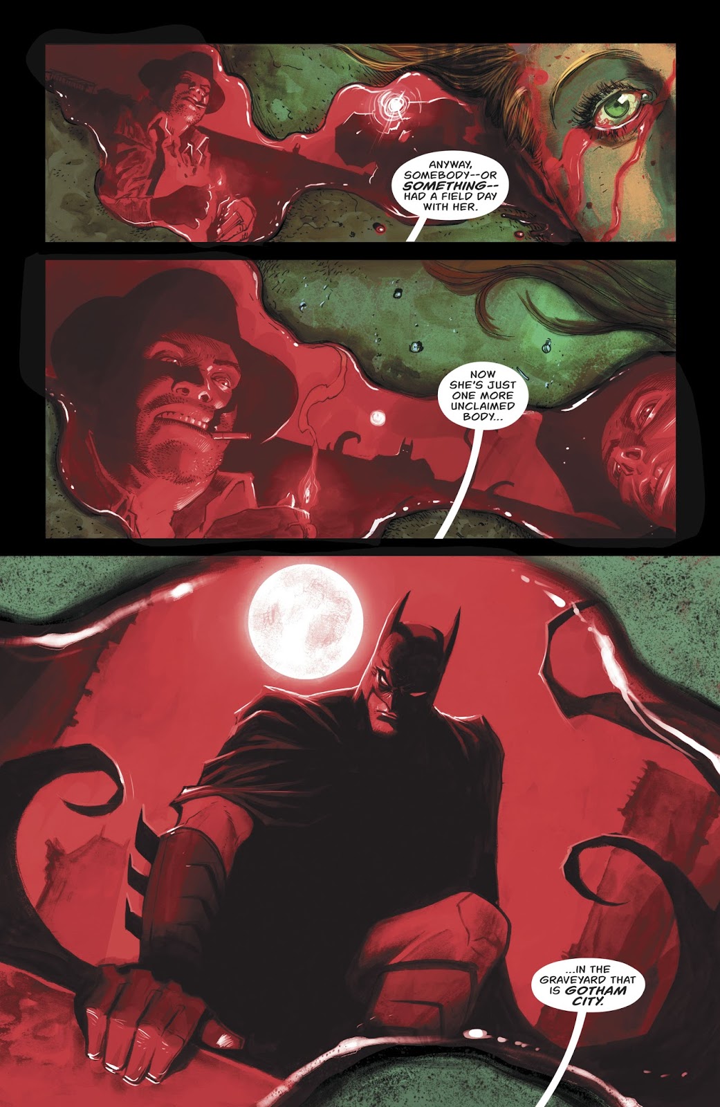 By the second page of Green Arrow 29, it is completely evident to me how excited Juan E. Ferreyra is to be working in Gotham City again. As Harvey Bullock inelegantly mourns the dead, Ferreyra uses the reflective crimson of the victim’s blood to show Batman approaching. Ferreyra hasn’t been holding back on the haunting imagery in Green Arrow, but this particular sequence hearkened to Gotham By Midnight.