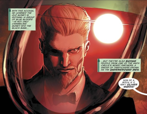 Of course it’s no mistake that the next page shows a similar introduction for Oliver Queen: this time in the reflection of the blood-red wine of a Gotham fat cat. Percy addresses the Oliver Queen/Bruce Wayne similarities by stating that Bruce only pretended to be a vapid rich boy whereas Ollie lived the part.
