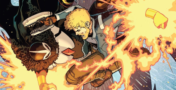 Along with drawing Rocket in a Baby Bjorn, Marcus To draws some Super Saiyan-type action in the battle between Star-Lord and Raptor Talonar.