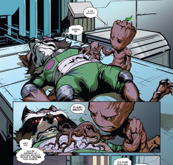 I was expecting a Groot ex machina: the ever-loving magical vegetation within Groot would heal the friend who understands him the best. Maybe it would work, who knows? Instead, Duggan gives Rocket a hero moment by sparing Groot from becoming infected himself.