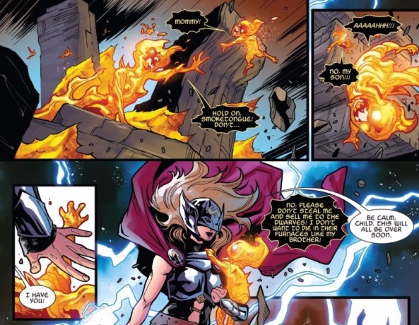 In saving this cute little fire demon Jane shows that Thors don’t kill innocent people, even in the name of revenge. Obviously the man who nearly killed this child, the War Thor, disagrees. To him, it seems a perfectly just act given the horror he has seen as Volstagg. While it’s tempting to say that the War Thor is acting very un-Thor like here, it’s important to remember his name. He is the War Thor and as such he is the living embodiment of the thing he takes his name from.