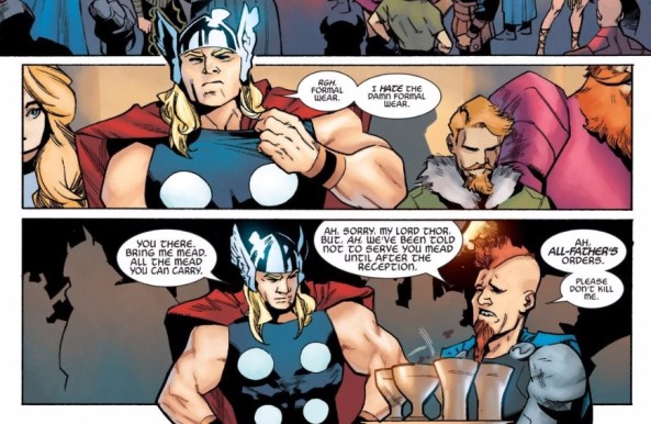 The humor that Aaron infuses into this story also does much to make it an unlikely source of entertainment. Much can be said for the banter Jane and the Odinson have with one another, or the way the vikings are pictured stealing the famous lost nose of the Sphinx. What really gave me a good laugh was when the Odinson complains about the formal clothes Odin makes him wear to a fancy Asgadian banquet.