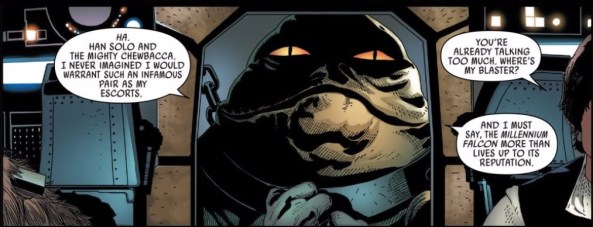 With that imagery in mind, Jason Aaron positions Grakkus as the devil on Han’s shoulder. Grakkus tries to pay off Han and wipe his debt with Jabba clean in order for his freedom. More importantly, Grakkus plays on Han’s fears that he’s going soft. He tempts Han with the swashbuckling life he once knew before he signed up with the Rebellion. It doesn’t hurt that he compliments the Millennium Falcon either.